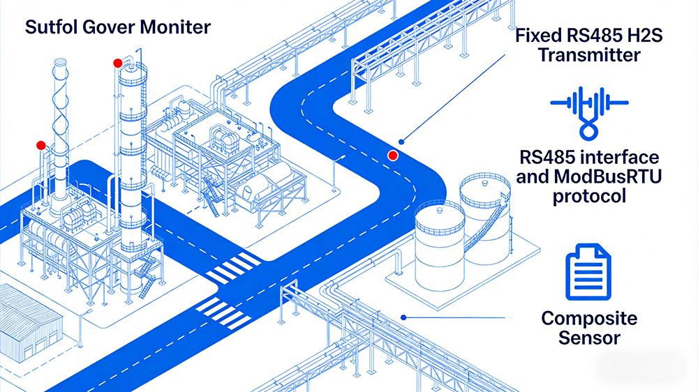 Para plantas petroquímicas con gases tóxicos e inflamables coexistentes, se recomienda una estrategia de "combinación punto-superficie": instalar transmisores fijos de sulfuro de hidrógeno RS485 cerca de posibles puntos de fuga de H₂S (equipados con interfaz RS485 y protocolo ModBus RTU, admiten la gestión centralizada de datos y permiten un monitoreo remoto conveniente) e implementar sensores compuestos en áreas de canales.