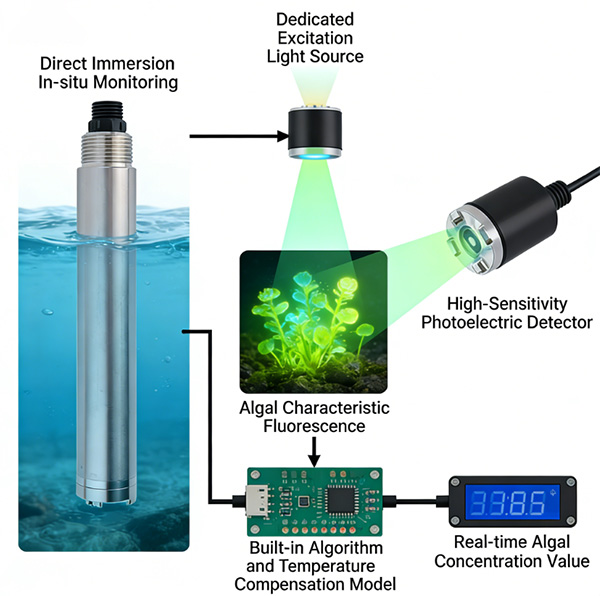 Este sistema no requiere reactivos químicos ni pretratamiento de muestras de agua durante todo el proceso, y permite la monitorización directa in situ mediante inmersión. Gracias a las características únicas de fluorescencia de la ficocianina y la clorofila de las algas verdeazuladas, el equipo cuenta con una fuente de luz de excitación específica y un fotodetector de alta sensibilidad. Tras excitar las células de algas para generar su fluorescencia característica, convierte rápidamente la señal de fluorescencia en valores de concentración de algas mediante un algoritmo integrado y un modelo de compensación de temperatura. Con una respuesta rápida y una alta precisión de detección, refleja fielmente la situación de las algas en tiempo real en los cuerpos de agua, solucionando por completo el problema de retardo de los métodos de detección tradicionales.