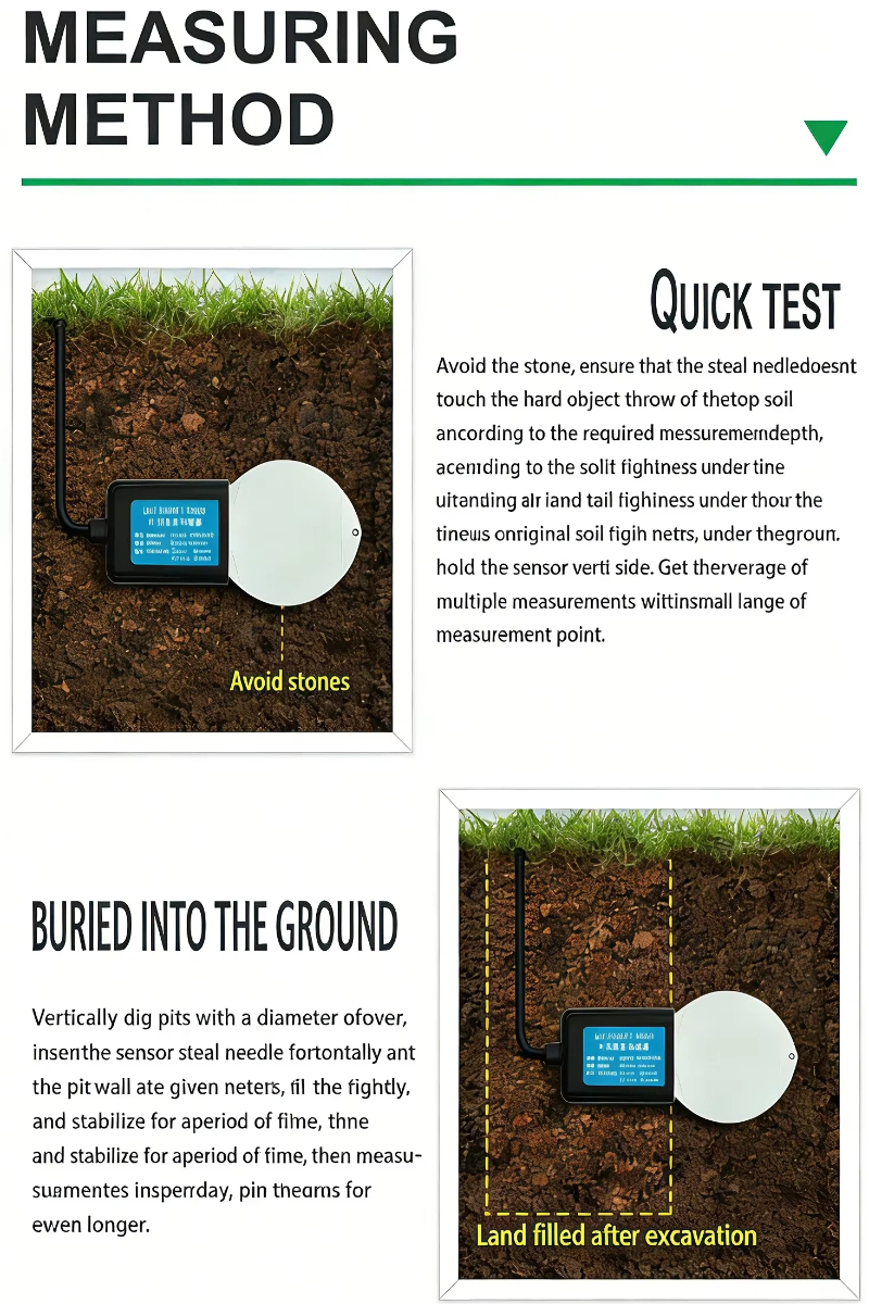 1. Alta precisión: mide con exactitud los cambios más leves en la temperatura y la humedad del suelo, con un amplio rango de medición.