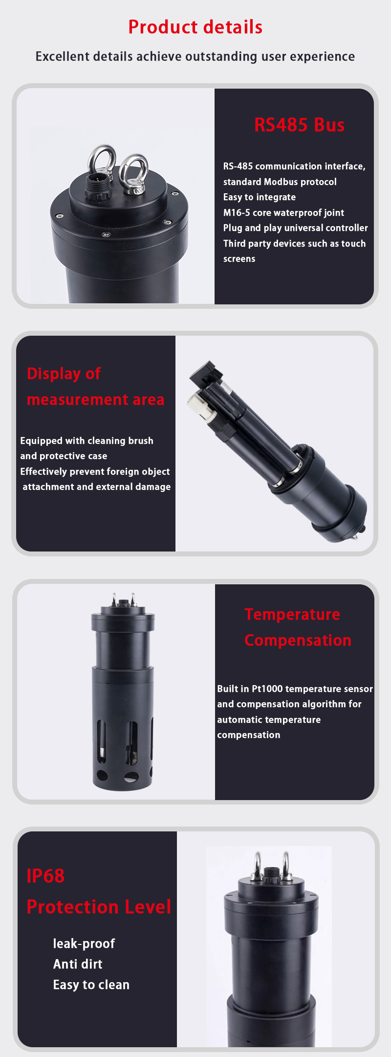 Con un diseño impermeable de grado industrial IP68 y materiales resistentes a la corrosión, funciona de forma continua en entornos acuáticos difíciles (por ejemplo, depósitos de aguas residuales, acuicultura costera) con requisitos mínimos de mantenimiento.