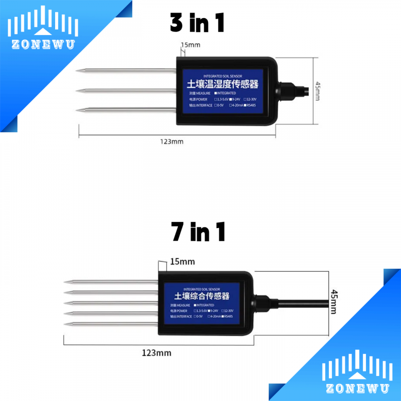El sensor de suelo multiparamétrico LoRaWAN de ZONEWU es un dispositivo inalámbrico de monitoreo de suelos diseñado para la agricultura de precisión. Su principal ventaja reside en aprovechar la tecnología inalámbrica LoRaWAN para lograr una recopilación estable y la transmisión a larga distancia de datos multidimensionales del suelo. A continuación, se presenta una introducción detallada de sus datos clave: