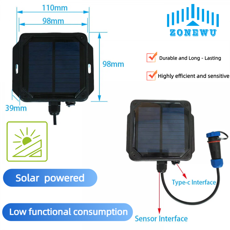 El sensor solar LoRa de CE/PH/temperatura y humedad del suelo ZONEWU es un dispositivo de monitoreo ambiental que integra energía solar y tecnología de comunicación remota. Su función principal es recopilar datos de CE/PH/temperatura y humedad del suelo en tiempo real.